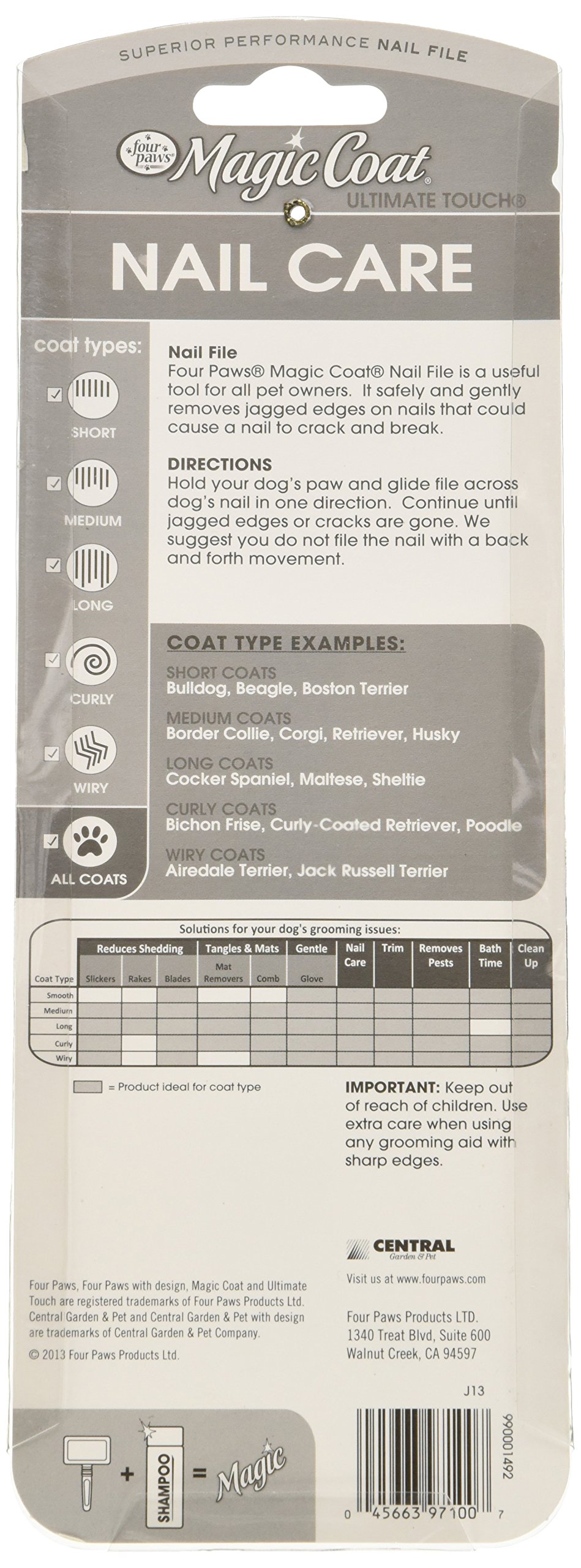 - Part of Four Paws’ Nail Care collection, this nail file safely and gently removes jagged edges on nails, reducing the chance of cracking or breaking